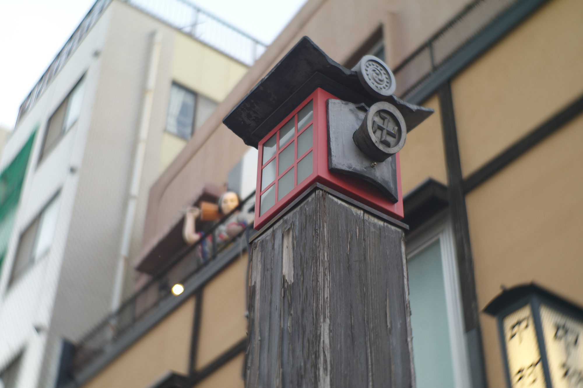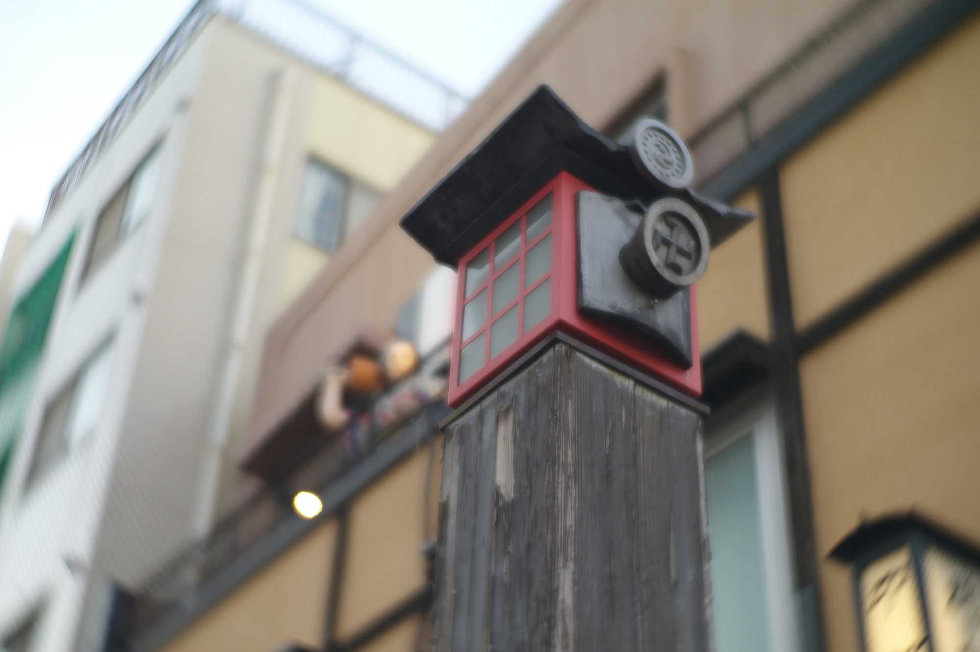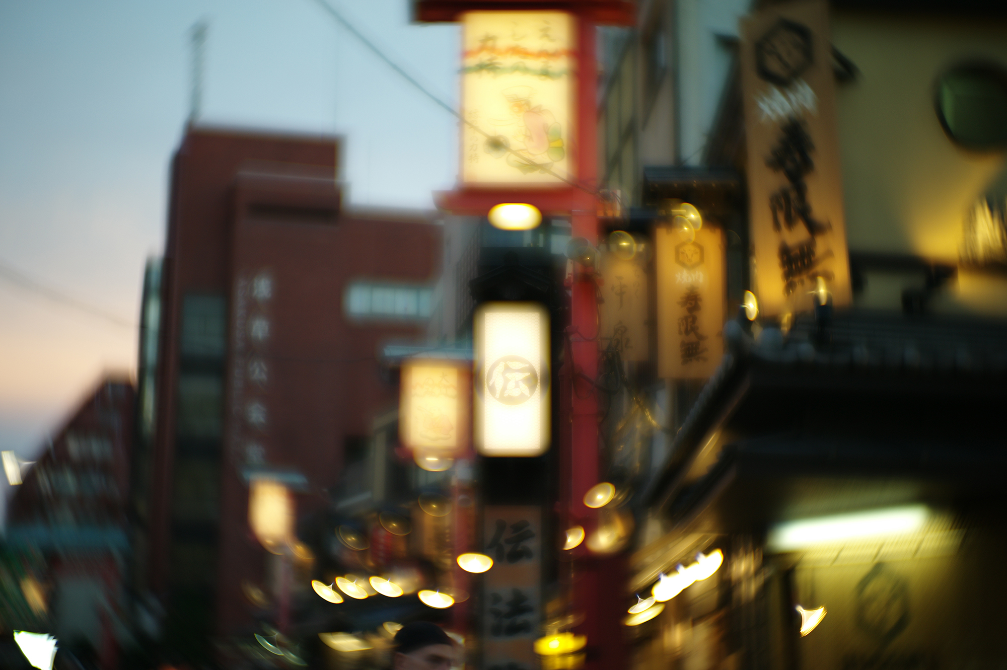 白濁が出る傾向のところに、割と強い光源で、しかも白い提灯です。f2.0なので深度があります。ともかく色はしっかり出ます。ガラスの厚みのためと思います。屋外でまだ暗くなっていません。